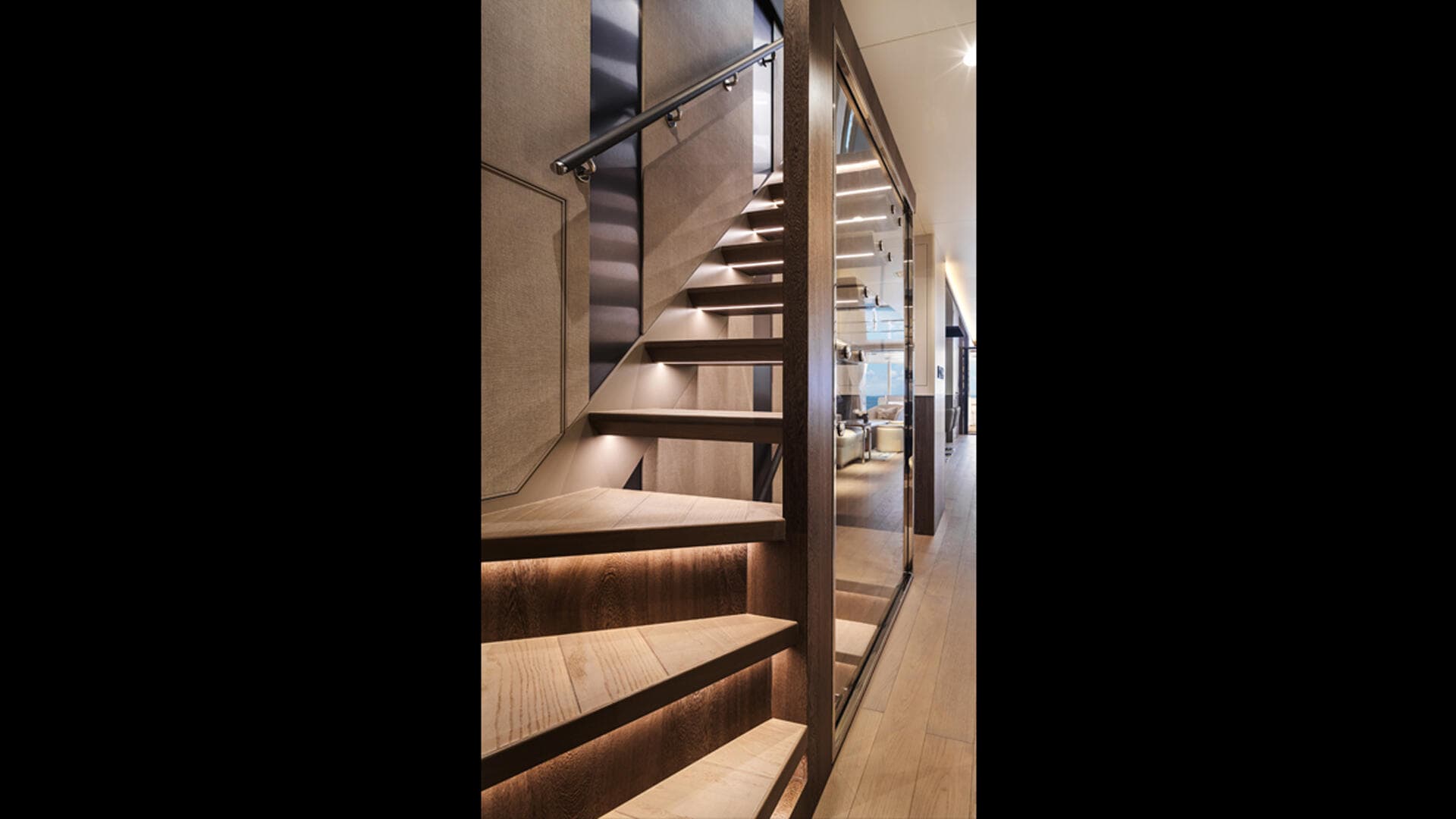 The tempered clear glass stairs create a soothing feel when transitioning to the lower deck, where three plush ensuite staterooms are positioned, including port and starboard VIPs and a forward VIP that can be transformed from a V-berth to a comfortable double bed.